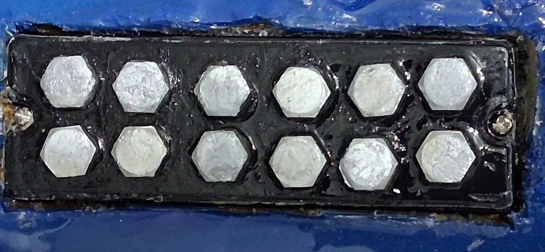 Bad Stain overwound the coils with extra tight tension, using 42 gauge polyurethane coated copper wire. Gio authorized Bad Stain to use whatever magnets they thought best. FrankenStain pickups are powered with rare Earth Neodymium Magnets, so Bad Stain started testing there first. Eventaully, Bad Stain and Gio chose to use a combination of magnets for the pickup. A large flat Neodymuim magnet sits on the bottom of both coils, with a row of AlNiCo 8 rod magnets inside the north coil and AlNiCo 4 rod magnets inside the south coil. Both coils have a row of large hex head bolt pole peices on each coil. The end result produces a powerful bright tone with a solid punch. The pickups are called the PC-03 Signature Series Gio-Magnetic Humbucker for 6 string bass.